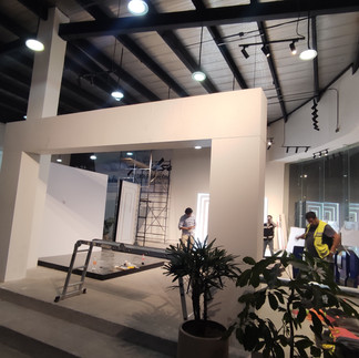 Para la instalación se comenzó por el acomodo de la iluminaria, para ende se utilizó como guía siluetas en masquen que simulaban los muebles del sitio. Posteriormente se colocó el mobiliario, los gráficos y finalmente la mercancía a exponer.
